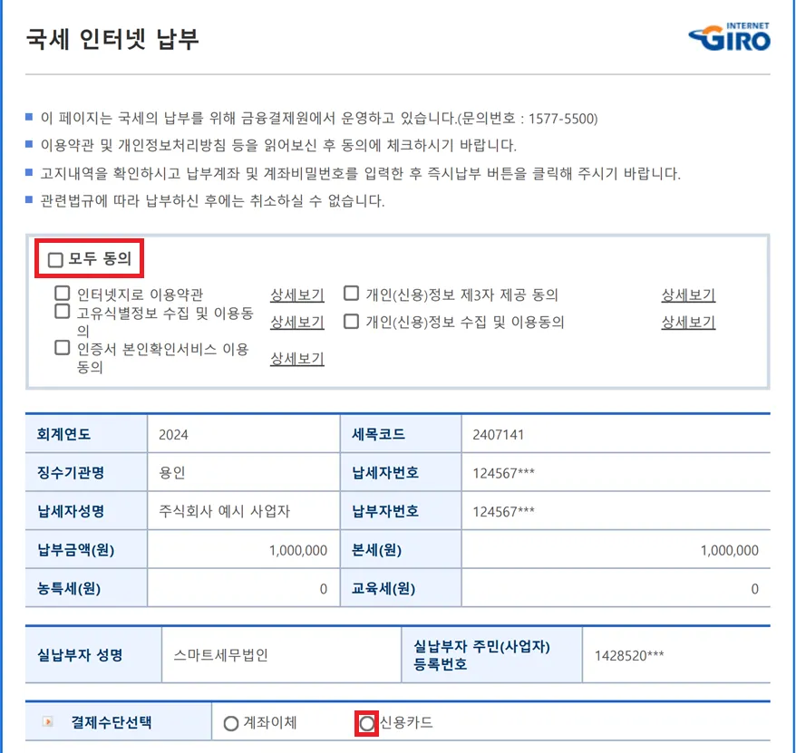 납부대행수수료(납부세액의 0.8%, 단 체크카드의 경우 0.5%)는 납세자 부담