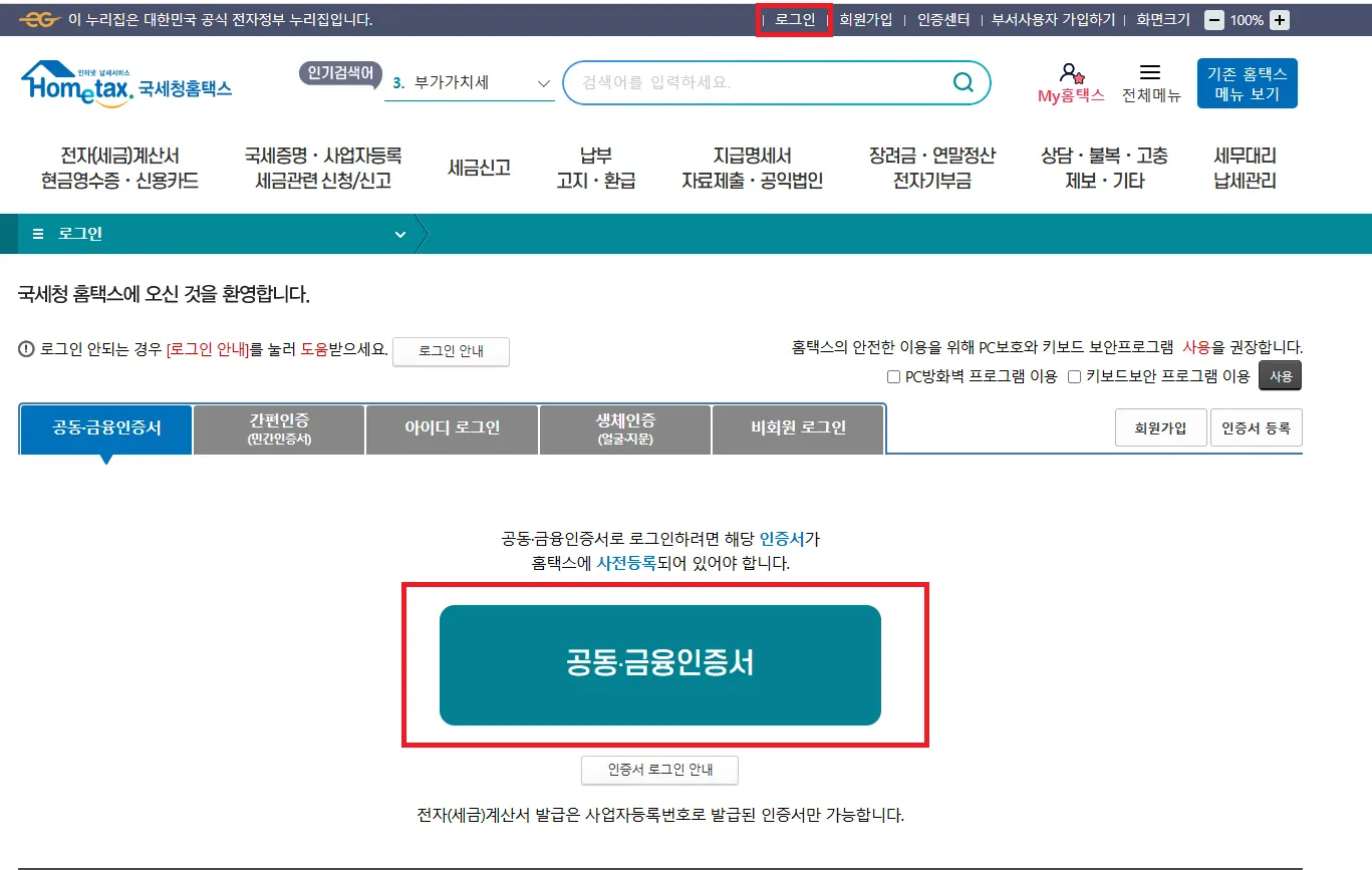 1. https://www.hometax.go.kr/ 국세청 홈택스 방문 후 공인인증서 로그인